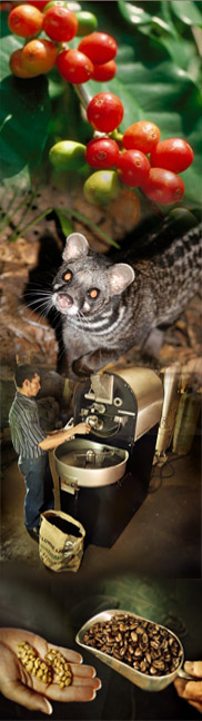 Kopi luwak coffee comes from the Indonesian Island of Java and Sumatra, an area well known for its excellent coffee. Also native to the area is a small civet-like animal called a Paradoxurus. That's the scientific name, the locals call them luwaks. These little mammals live in the trees and one of their favorite foods is the red, ripe coffee cherry. They eat the cherries , bean and all. While the bean is in the little guy's stomach, it undergoes chemical treatments and fermentations. The bean finishes its journey through the digestive system, and exits. The still-intact beans are collected from the forest floor, and are cleaned, then roasted and ground just like any other coffee.